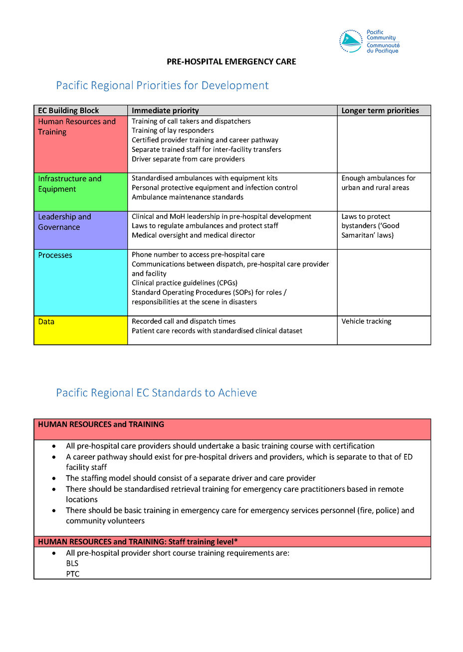 Pacific Regional Emergency Care: Priorities and Standards for Development
